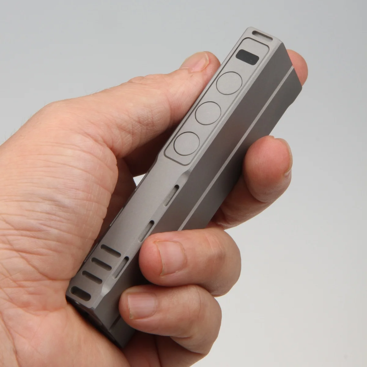 This laser pointer is one of our newest products in 2025, featuring a stone-washed square housing, an integrated LED flashlight, and newly developed Bluetooth functionality. The 488nm cyan laser (485nm is optional) is visible in daylight, and the output is stable. Although the size is relatively small, the heat dissipation system and PCB protection are available, so you don't need to worry about overheating or overvoltage. If you choose the housing with engraving (version 2 or version 3), the tritium vials are installable.