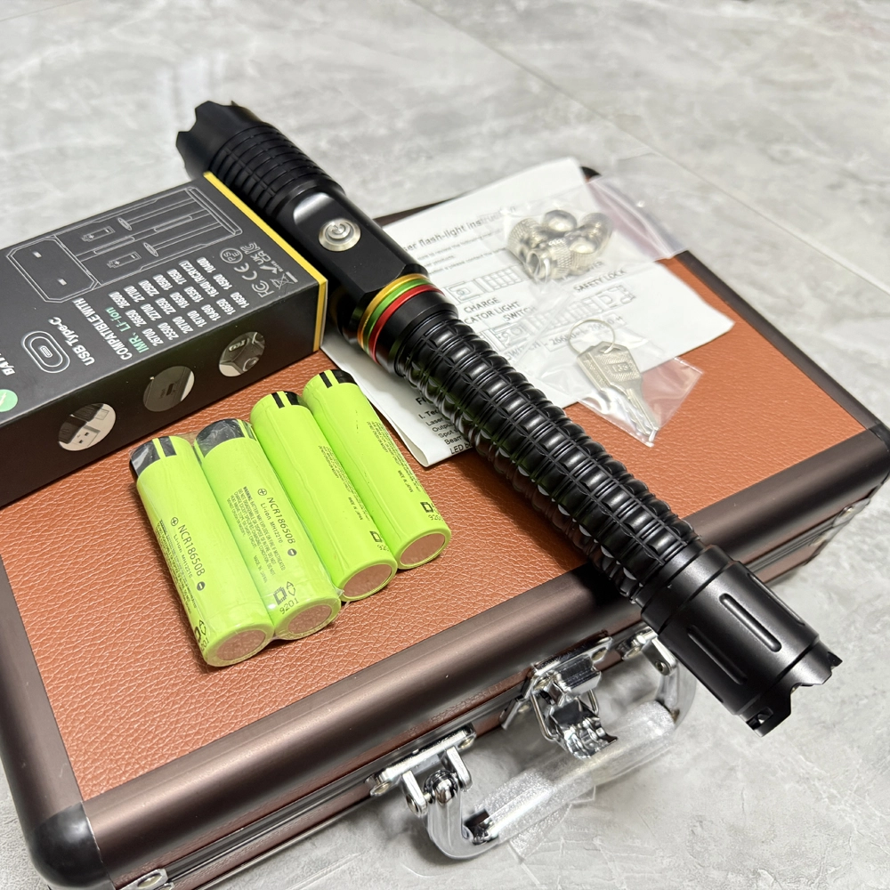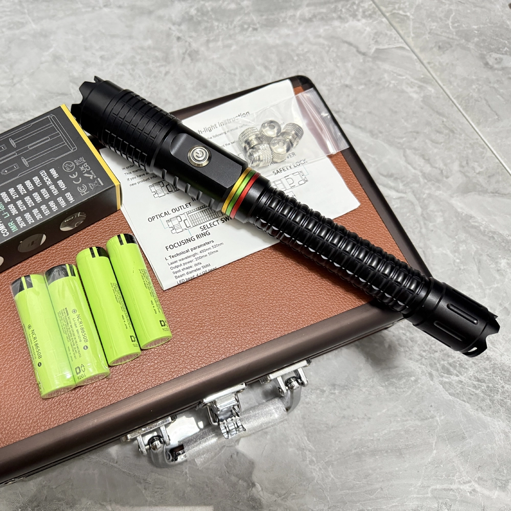 3) Professional package: blue laser pointer + four 18650 batteries + professional charger + safety goggles (OD4) + five pattern heads + lens cleaning cloth + English instruction manual + explosion-proof aluminum suitcase