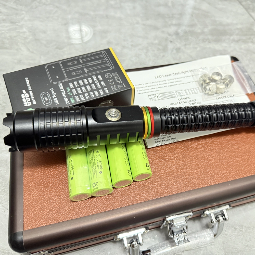 3) Professional package: green laser pointer + four 18650 batteries + professional charger + safety goggles (OD4) + five pattern heads + lens cleaning cloth + English instruction manual + explosion-proof aluminum suitcase