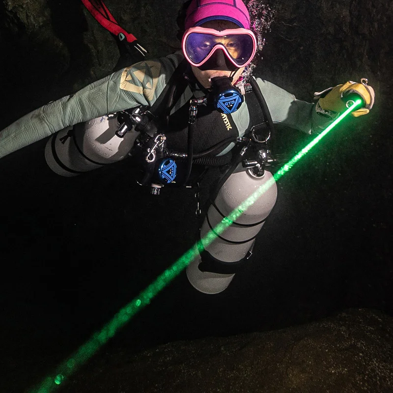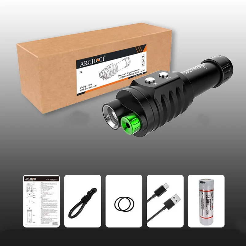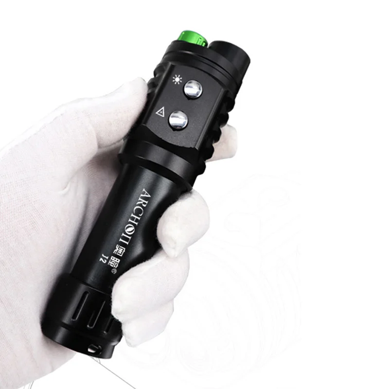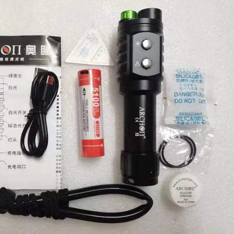 This product is a 2-in-1 portable diving flashlight with a white light spotlight and a green laser. It is designed to provide diving signal guidance, underwater lighting, and underwater communication between divers. Its body is light and easy to carry, making it an ideal light source for divers. This laser flashlight is suitable for diving, firefighting, flood control, fishing and hunting, outdoor adventures, etc. A full range of accessories is available; you don't need to pay customs or other additional fees.